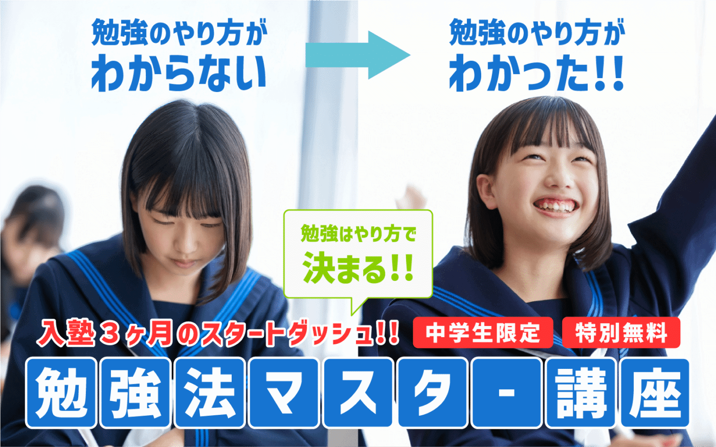 入塾3ヶ月の間、無料で勉強のやり方を5教科指導いたします。その後も自分に合わせた勉強のやり方が身につくように徹底的にサポート!!